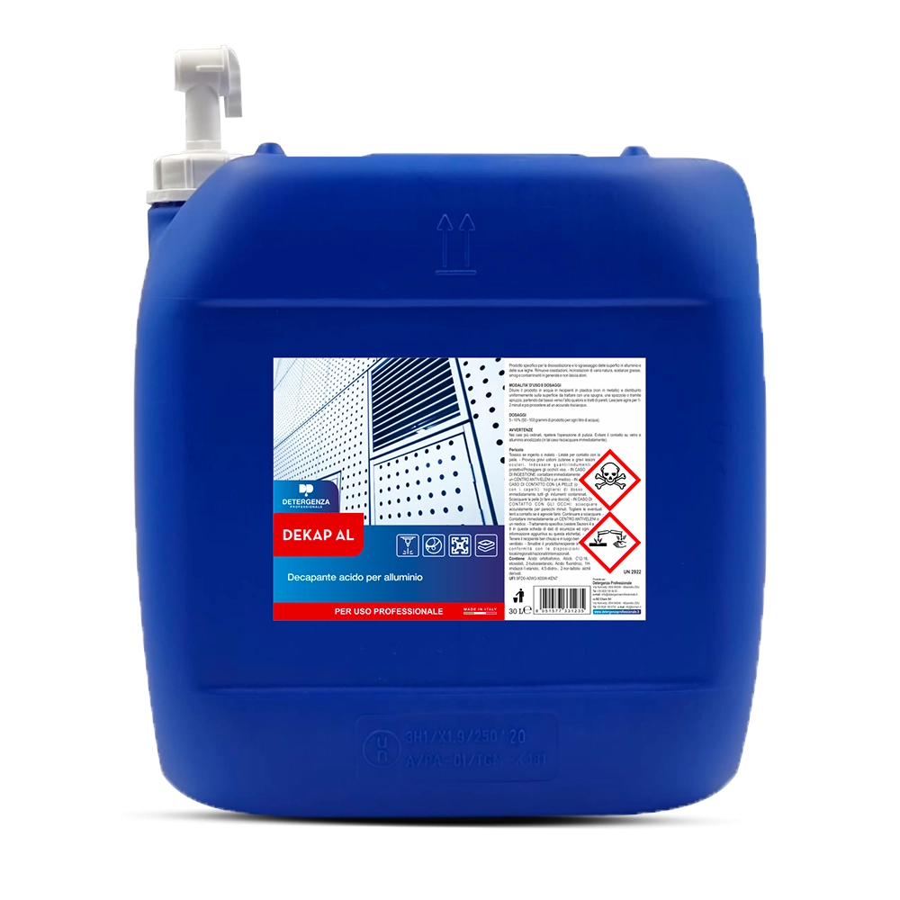 Dekap Al è un decapante acido professionale formulato per la rimozione efficace di ossidazioni, incrostazioni, smog, sostanze grasse e contaminanti da superfici in alluminio e sue leghe. Grazie alla sua composizione chimica avanzata, evita l’uso di abrasivi, preservando l’aspetto brillante dei manufatti trattati senza lasciare aloni.